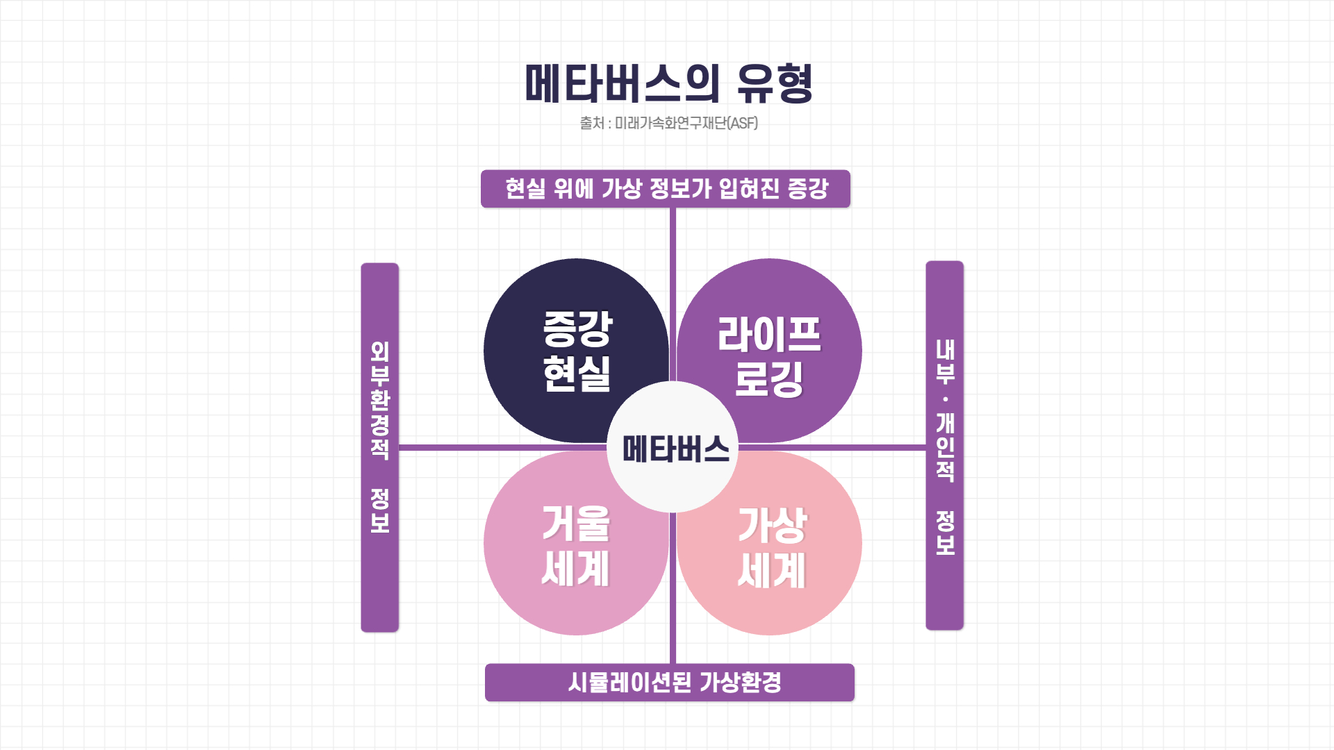 미국의 비영리기술연구단체인 ASF(Acceleration Studies Foundation)는 메타버스를 구현공간과 정보형태에 따라 다음과 같이 4가지 유형으로 분류했습니다.