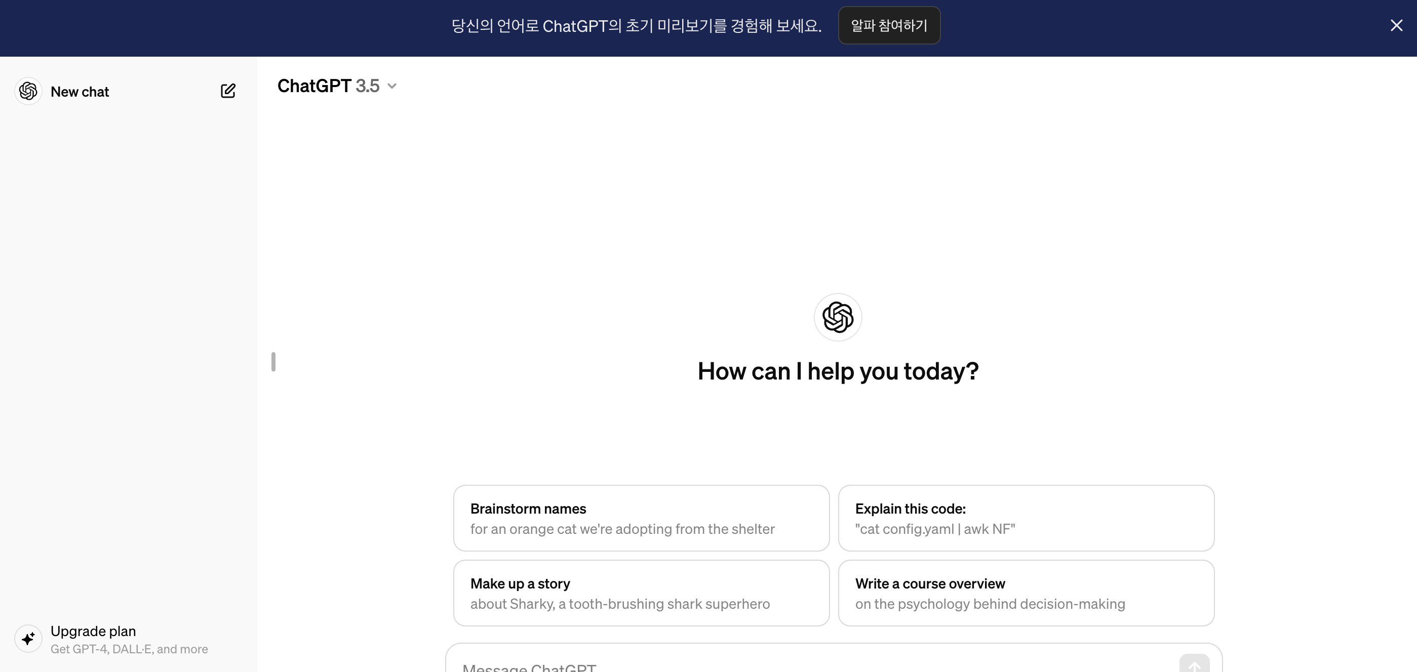 저의 경우 기존에 있던 구글 계정을 사용했습니다. 이 경우 이름과 생년월일을 입력한 뒤 이용 약관에 동의해 주면 바로 사용이 가능합니다. '화면의 상단에 당신의 언어로 챗GPT 초기 미리보기를 경험해보세요'라는 문구와 함께 '알파 참여하기' 버튼이 있습니다. 다양한 언어 사용자들의 편의성을 고려하여 최근 도입된 기능으로 영어로 학습된 챗GPT 모델이 한국어를 포함한 다른 언어에 적절히 대응할 수 있도록 지원하고 있습니다. 다른 언어로의 변경은 설정에서 쉽게 가능합니다. 영어를 기반으로 하는 프로그램이다보니 아직 다른 언어로의 사용이 매끄러운 편은 아닙니다.